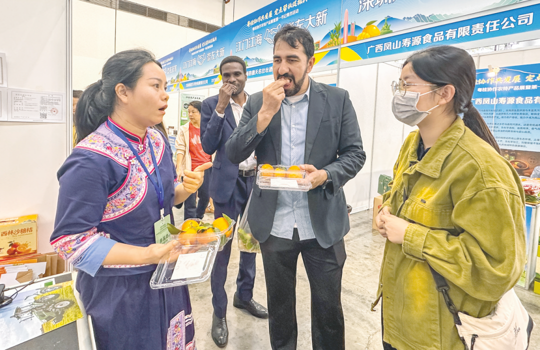 外籍嘉宾试吃广西水果。 (彭寰 摄)